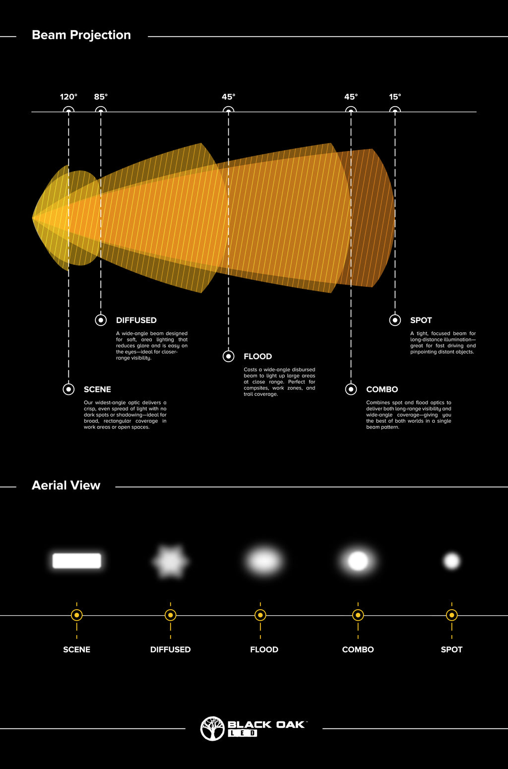 Flood- Wide-spread light to illuminate the side and front of your rig. Perfect for those who want a wider cone of light than a spot.
