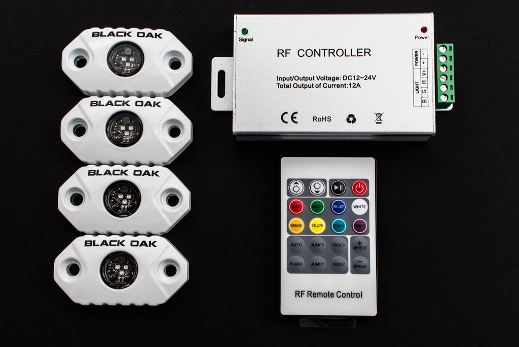 One of our favorite products over here at Black Oak is our RGB Accent Lights! Since we now offer not only the RGB LEDs, but also the RGB Controller and RGB Wire, we thought it would be a fantastic idea to create a BYO kit. This way it keeps things simple and everything you need for installing is right here. You have the choice of either White or Black Housing for the LED. Then you can decide on how many RGB LEDs you will need for your install, our RGB Controller can run up to 12 LEDs per remote. And lastly, the RGB Wire is Insulated 22 AWG Tinned Copper which feeds directly into our RGB Controller with the RGBV+ inputs. We offer in 25-125 foot increments with this kit.